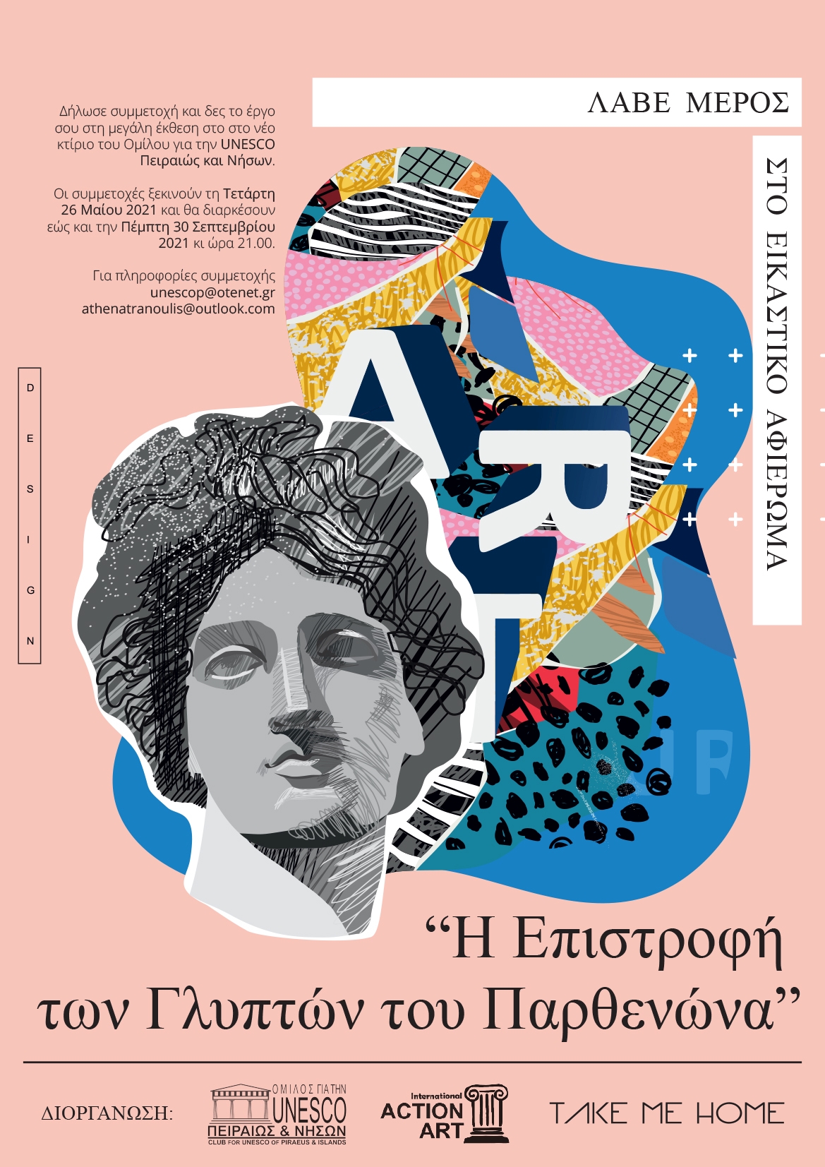 Ο Όμιλος για την UNESCO Πειραιώς και Νήσων και ο Διεθνής οργανισμός INTERNATIONAL ACTION ART, σε συνεργασία με το κίνημα ΄΄Take Me Home’’ της Αθηνάς Τρανούλη, διοργανώνουν εικαστικό αφιέρωμα με θέμα «Η Επιστροφή των Γλυπτών του Παρθενώνα».  Η τέχνη αποτελεί μοχλό αντίστασης για τους πολίτες και κατ΄επέκταση για το ευρύ κοινωνικό σύνολο, φαίνεται επίσης πως κατορθώνει να απαντά στις ψυχές όλων, αναδεικνύοντας έτσι  τη σπουδαιότητά της!  Η κίνηση αυτή έχει σαν στόχο ο καλλιτέχνης να βρεί διέξοδο μέσω της δημιουργίας και να  «αναστατωθεί» πνευματικά.