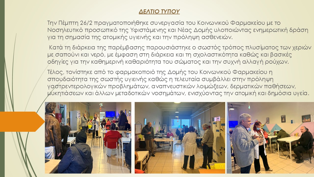 ΕΝΗΜΕΡΩΤΙΚΗ ΔΡΑΣΗ ''ΑΤΟΜΙΚΗ ΥΓΙΕΙΝΗ & ΠΡΟΛΗΨΗ ΑΣΘΕΝΕΙΩΝ'' Τα Νέα των Δομών Facebook Twitter Προηγούμενο Επόμενο