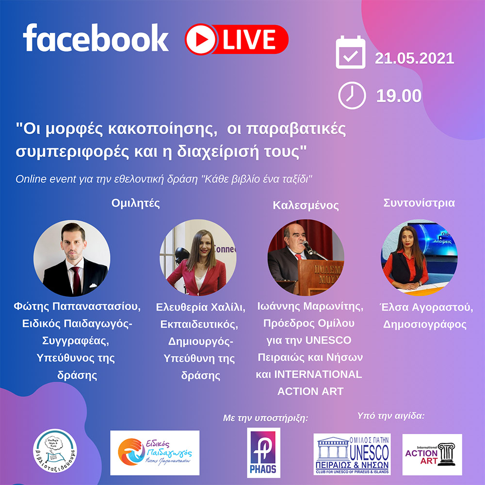 Σας προσκαλούμε στο ONLINE LIVE EVENT, που θα πραγματοποιηθεί στις 21 Μαΐου 2021, στις 19:00, μέσω FaceBook, με θέμα: «Οι μορφές κακοποίησης, οι παραβατικές συμπεριφορές και η διαχείρισή τους».