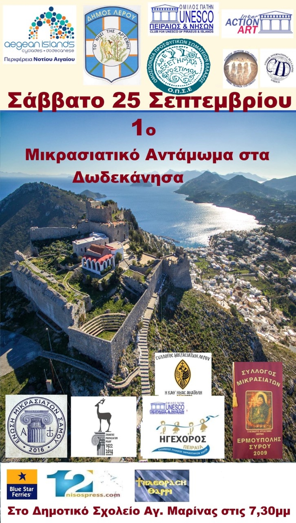 1ο ΜΙΚΡΑΣΙΑΤΙΚΟ ΑΝΤΑΜΩΜΑ ΣΤΑ ΔΩΔΕΚΑΝΗΣΑ 2021 Σάββατο 25 Σεπτεμβρίου 2021, 7.30μμ 1ο Μικρασιατικό Αντάμωμα στα Δωδεκάνησα στο νησί της Λέρου, Δημοτικό Σχολείο Αγίας Μαρίνας Facebook Twitter Προηγούμενο Επόμενο